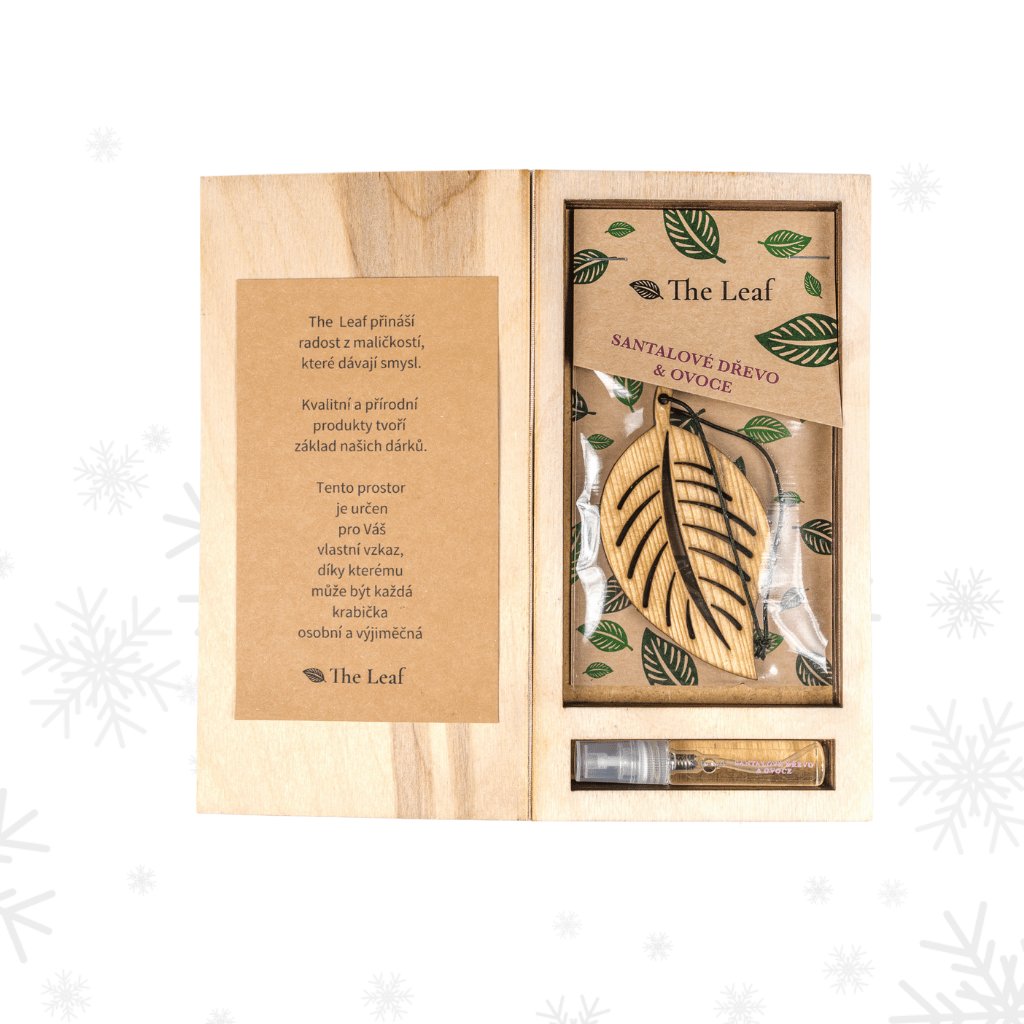 Obsah balení: 1ks vonného lístečku do auta, 1ks osvěžovače o objemu 5ml, vánoční balení, možnost vlastního vzkazu.