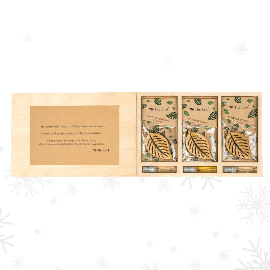 Obsah balení: 3ks vonných lístečků do auta, 3ks osvěžovačů o objemu 5ml, vánoční balení.